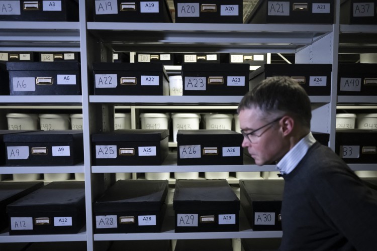 O patologista Martin Wirenfeldt Nielsen passa por caixas, no porão da Universidade do Sul da Dinamarca, em Odense, em 28 de janeiro de 2023