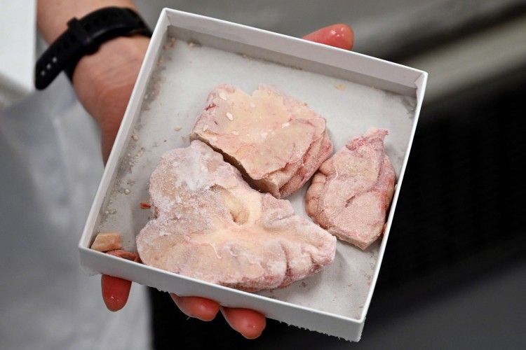 Um funcionário mostra uma caixa com fragmentos de cérebro humano, no laboratório do hospital Bispebjerg, em Copenhague, em 3 de fevereiro de 2023