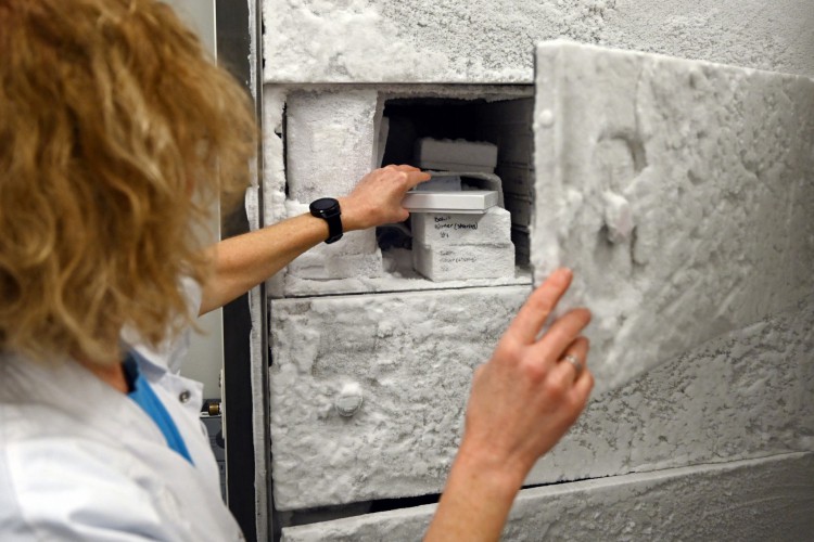 Susana Aznar Kleijn pega uma caixa com fragmentos de cérebro humano de uma geladeira, no laboratório do hospital Bispebjerg em Copenhague, em 3 de fevereiro de 2023