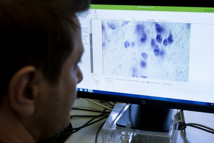 Um funcionário estuda fragmentos de cérebro humano no laboratório do hospital Bispebjerg em Copenhague em 3 de fevereiro de 2023