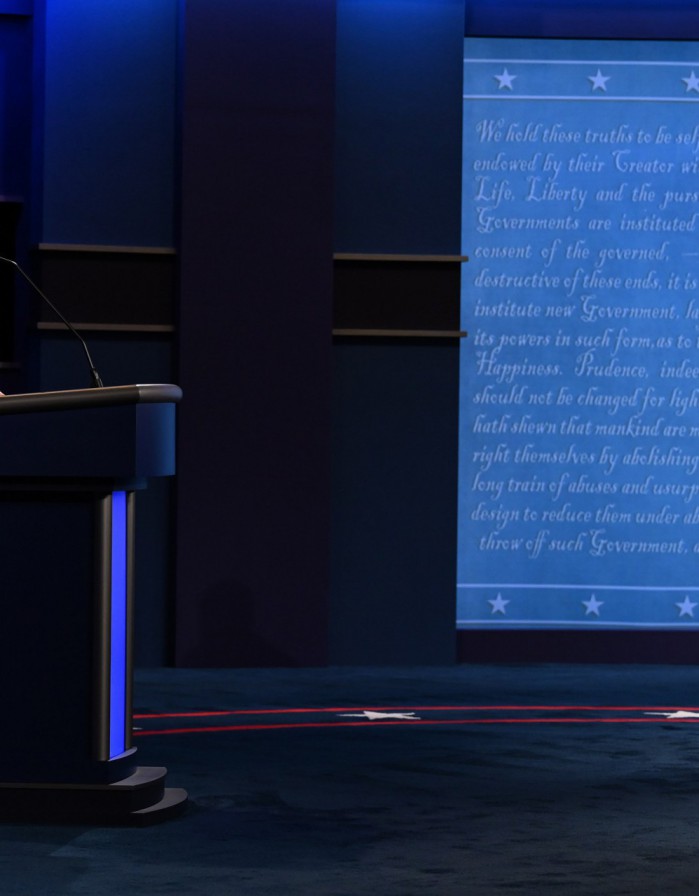 Um cara e coroa na moeda determinou que Joe Biden poderia escolher o lugar que deseja ocupar no pódio - escolheu a direita - e a ordem das declarações finais. Trump terá a última palavra no debate.