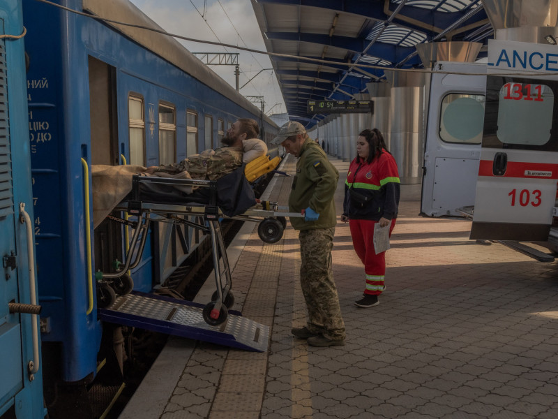 Parece um trem comum esperando para sair de uma estação comum, mas através de suas janelas embaçadas é possível ver um soldado ucraniano com ferimentos no rosto, deitado em uma maca. Os demais vagões azuis e amarelos deste trem do Exército transportam soldados feridos para hospitais longe da precária região de fronteira.