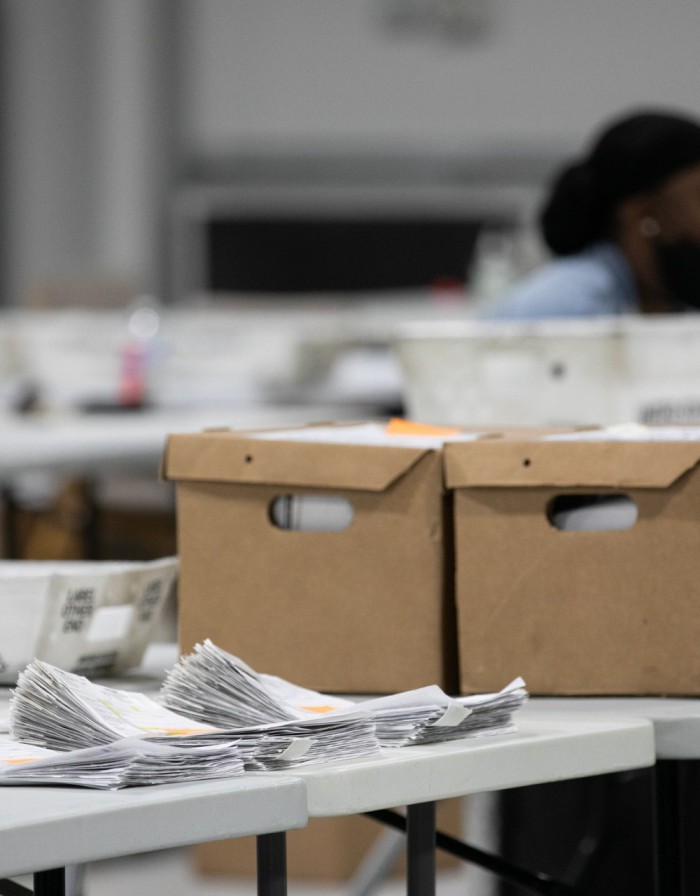 Atrás dele, telões projetam os sinais das emissoras de notícias CNN, Fox e MSNBC, que, por sua vez, competem para entregar resultados ao público assim que as seções eleitorais começam a fechar em todos os Estados Unidos.