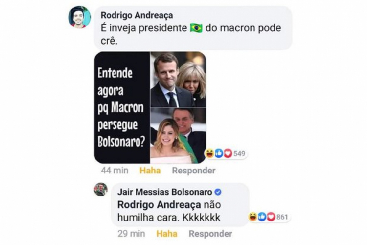 No fim de semana, um internauta publicou fotos comparando a aparência de Michelle Bolsonaro e Brigitte Macron. O apoiador do presidente comentou: "É inveja presidente do Macron pode crê". Bolsonaro respondeu: "Não humilha, cara. kkkkkkk".