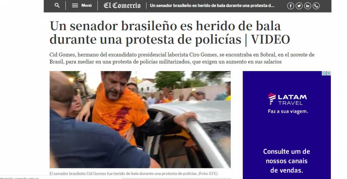 Imprensa internacional repercute ataque a Cid Gomes: "Senador brasileiro baleado durante greve policial"