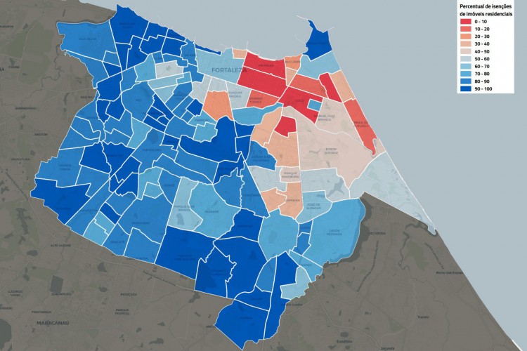A seguir na lista dos menores percentuais de residências isentas estão Dionísio Torres (13,2%), Praia do Futuro II (17,2%), Papicu (19,4%), Mucuripe (22,3%) e Fátima (27,7%).