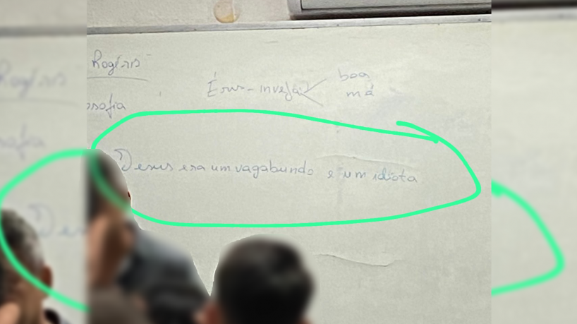 “Uma aluna, do primeiro ano do ensino médio da escola Telina Barbosa, de forma escondida fotografou o quadro onde o professor de filosofia, a próprio punho, escreveu a seguinte frase: ‘Jesus era um vagabundo e um idiota’. (...) Aqui é muito simples fazer a perícia da letra do professor. Ele pode escrever o que quiser na vida dele, mas não na sala de aula”, criticou.