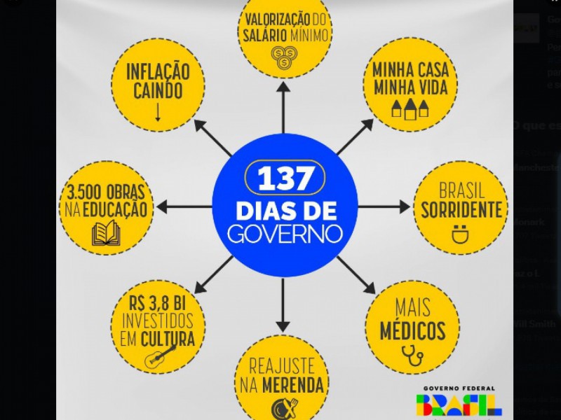 Na publicação, há um círculo escrito "137 dias de governo" e diversas setas saindo dele. Ao redor, estão escritos, também em círculos: valorização do salário mínimo, Minha Casa, Minha Vida, Brasil Sorridente, Mais Médicos, Reajuste na merenda, R$ 3,8 bi investidos em cultura, 3.500 obras na educação, inflação caindo.