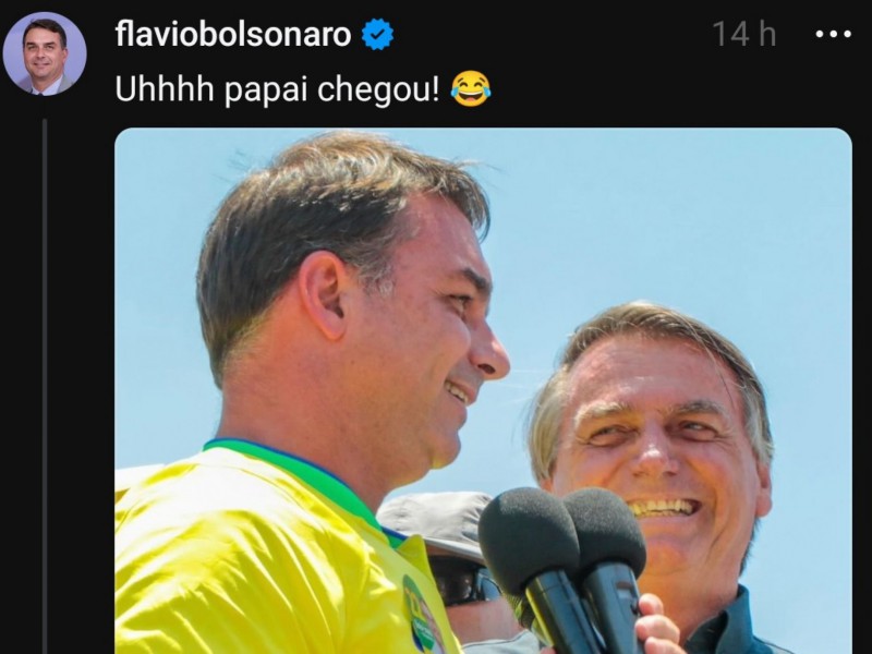 Em sua primeira postagem na rede social, Flávio Bolsonaro compartilhou uma foto dele ao lado do pai, o ex-presidente Jair Bolsonaro (PL) com a legenda: "Uhhh papai chegou!"