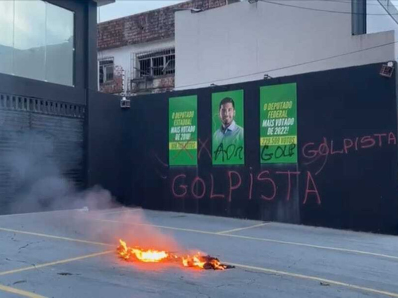 O movimento Levante Popular da Juventude realizou atos de vandalismo pichando o comitê do deputado federal André Fernandes com a palavra "golpista" e queimou um boneco com o seu rosto na madrugada desta segunda-feira, 1.