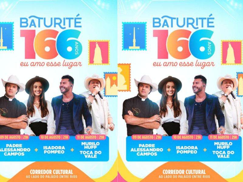 O evento tem três dias de programação, marcados para as datas 9, 10 e 11 de agosto. Entre as apresentações previstas, estão o cantor Murilo Huff, o padre Alessandro Campos, a pastora Isadora Pompeo e o cantor Toca do Vale.