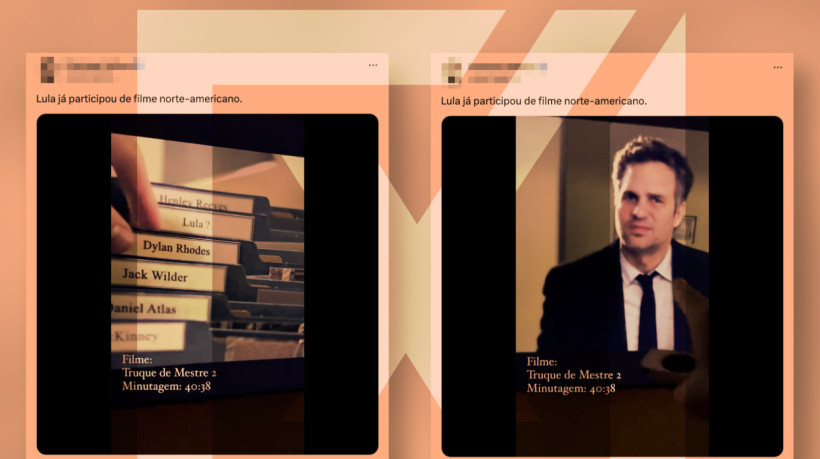 Conteúdo investigado: Vídeo em que um homem grava uma tela em que é exibido o filme “Truque de Mestre 2: O Segundo Ato”. Ele diz: “Esse ator, Mark Ruffalo, vai entrar na sala agora para ver as pastas dos maiores ladrões do mundo”. Em seguida, pergunta: “Você viu o que apareceu ali?”. O autor do vídeo volta o filme e mostra o trecho em que aparecem arquivos com nomes de personagens em etiquetas e, em uma elas, está escrito “Lula ?”.