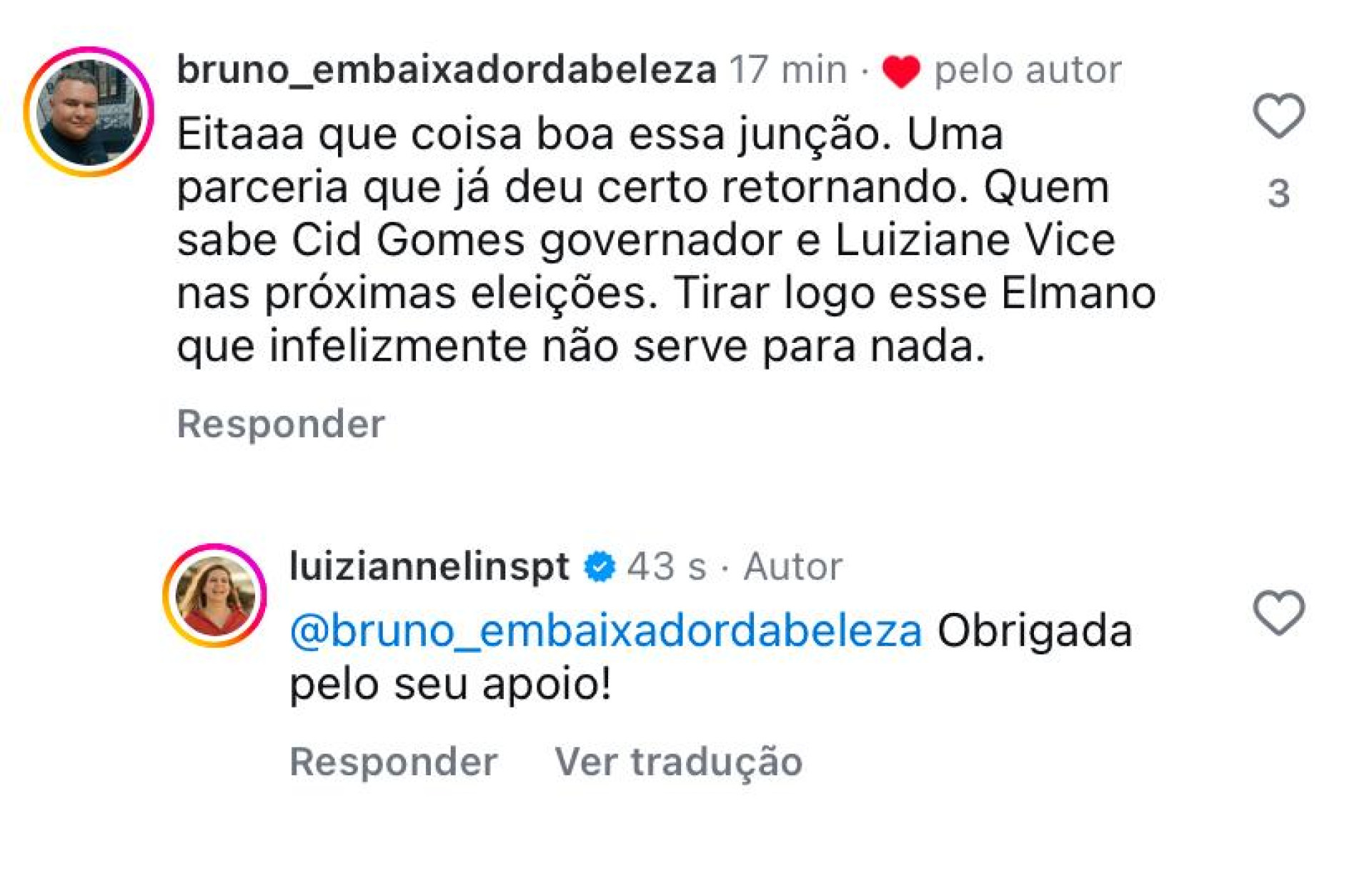 Além disso, o seguidor criticou o governador Elmano de Freitas (PT), dizendo que ele "infelizmente não serve pra nada". Luizianne curtiu e respondeu ao comentário agradecendo o apoio.