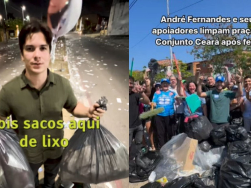 Após ato realizado na noite desse sábado, 21, pelo candidato André Fernandes (PL) com a presença do deputado federal Nikolas Ferreira (PL-MG), o vereador Gabriel Aguiar (Psol) foi às redes sociais denunciar sujeira deixada na Praça da Caixa Econômica, no bairro Conjunto Ceará, em Fortaleza. Na tarde deste domingo, 22, o candidato a prefeito de Fortaleza publicou vídeo limpando o local.