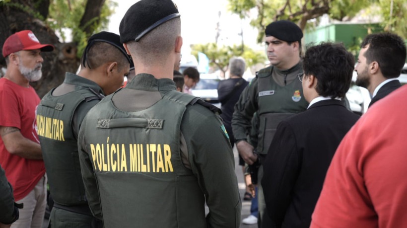 O excesso de pessoas ao redor do Centro Universitário Farias Brito, onde vota o candidato Evandro Leitão (PT), ocasionou o aumento do contingente policial no local, na manhã deste domingo, 27.