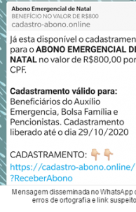 Uma mensagem no WhatsApp vem anunciando um suposto novo benefício do Governo Federal: um Abono Emergencial de Natal no valor de R$ 800. Porém, o recurso é falso e leva o usuário a fornecer dados pessoais que poderão ser roubados posteriormente. A veracidade do benefício foi analisada por especialistas da empresa Kaspersky Lab, especializada em verificar malefícios no mundo online. Os golpes envolvendo recursos como auxílios do governo federal, promoções ou datas comemorativas são os típicos perfis brasileiros encontrados pela empresa.