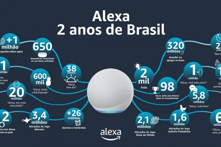Hoje, sábado, 6 de novembro (06/11), a inteligência artificial da Amazon, Alexa, completa dois anos desde seu lançamento no Brasil - e 7 anos do serviço no mundo. Capaz de realizar tarefas diversas como controle de fechaduras, câmeras, lâmpadas e aplicativos com um simples comando de voz, a assistente já faz parte da vida de muitos brasileiros.