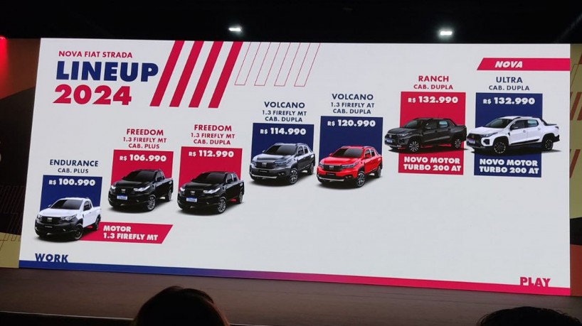 A Fiat Strada 2024 teve seu lançamento anunciado nesta semana, em Florianópolis, Santa Catarina. Com motor 1.0 turbo e um design mais robusto, a picape sairá da fábrica para as concessionárias com um preço que vai de R$ 100 mil a R$ 135 mil.