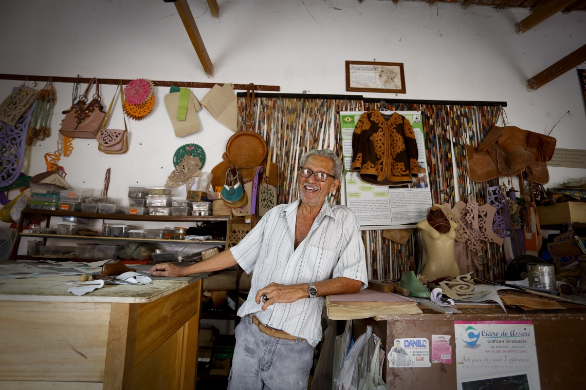 Entre as suas obras mais copiadas estão sandálias e bolsas que seguem o seu estilo característico de arte em couro. “Eu não tô proibindo ninguém de fazer bolsa, sandália ou chapéu. Pode todo mundo fazer. Agora, o que eu não quero é que façam o estilo do desenho que eu criei e que traz uma característica minha”, ressalta o mestre da Cultura.