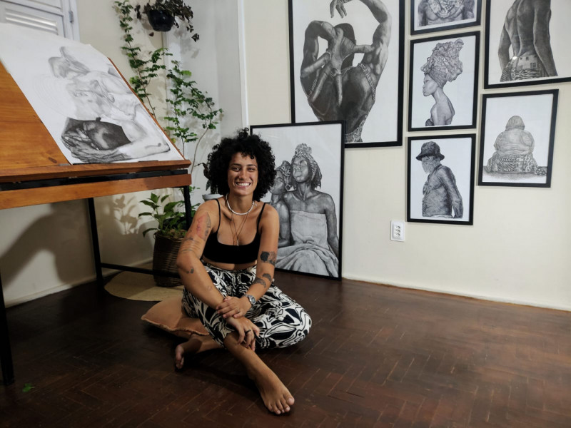 A desenhista busca potencializar a cultura do povo preto nos desenhos, priorizando retratos de “paz e alegria”. “A gente fala muito da história da cultura e a gente sabe que teve escravidão, muita desigualdade. As obras vão para um lugar mais leve do que se costuma estar, principalmente dentro da arte, onde o povo preto raramente é retratado como pessoas felizes", desenvolve.