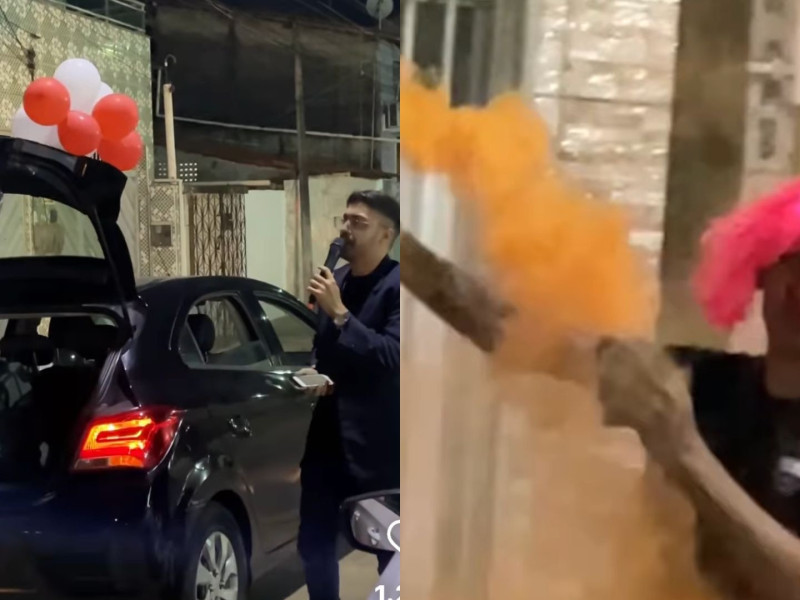 No registro, a vizinhança se diverte com o carro cheio de balões, a fumaça colorida e o discurso de um dos funcionários.