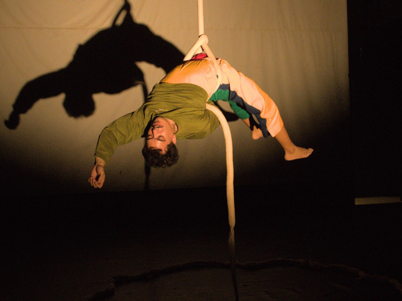 A montagem aborda uma experiência lúdica em torno do “erro”, com uma sessão de acrobacia aérea em corda lisa e equilíbrio sobre as mãos.