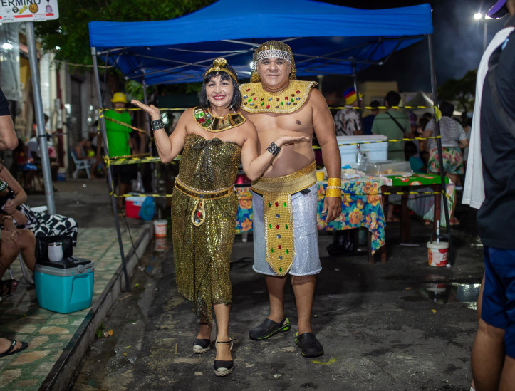 No Mercado dos Pinhões, poucos foliões foram fantasiados neste sábado. Mas um casal presente no polo faz questão de combinar fantasias em todas as festas. José Alberto Lima, 52, e Roseane Chagas, 52, foram de Cleopatra e Faraó.