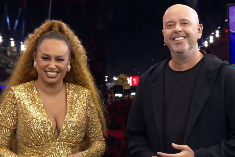 Karine Alves e Alex Escobar foram os responsáveis por coordenar, diretamente do estúdio, a comunicação com quem estava cobrindo o desfile na avenida, trabalho feito por influenciadores neste ano.