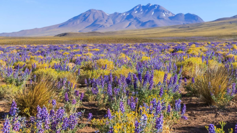 Há ainda outra boa surpresa durante a primavera: geralmente a partir de setembro, o Atacama ganha novas cores graças a bulbos que resistem ao clima rigoroso e brotam como flores roxas e brancas de variadas espécies, cobrindo campos inteiros. O fenômeno é conhecido como “deserto florido” e depende da quantidade de chuvas durante o inverno.