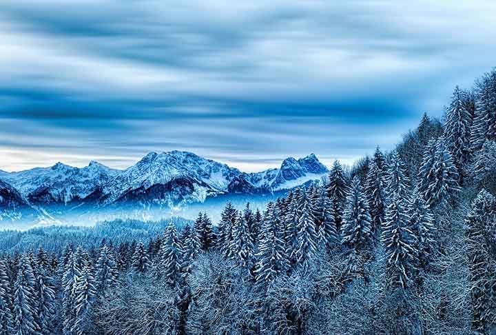Natureza adaptada ao frio: Árvores coníferas embelezam paisagem de vastas florestas
