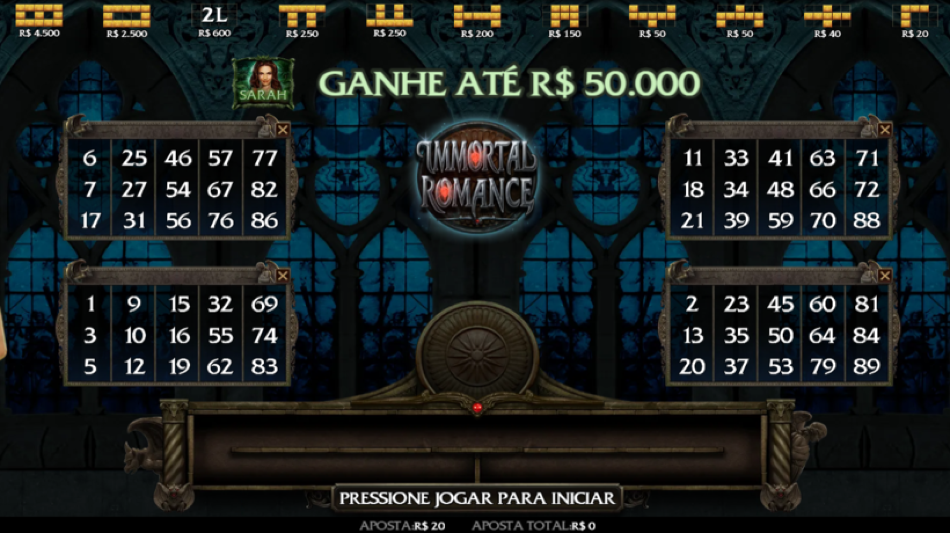 O jogo de raspadinha de bingo Immortal Romance paga até 10.000x o valor da aposta e traz a possibilidade de comprar entre 1 e 4 cartelas por rodada.