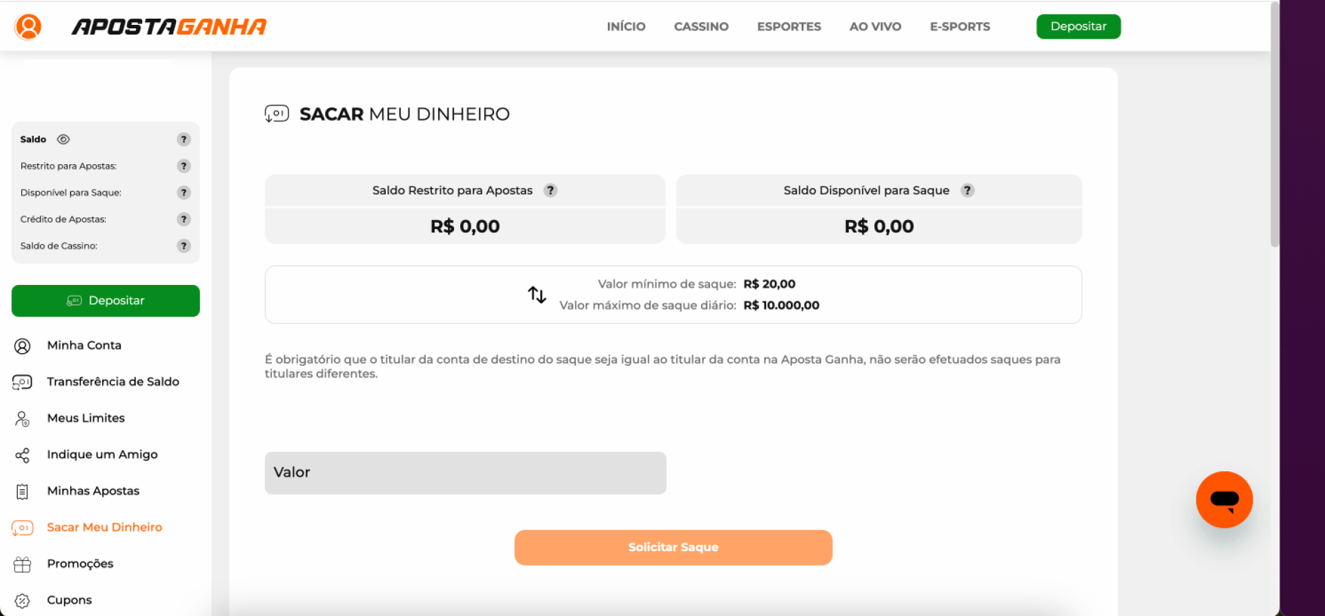 Qual o valor mínimo para sacar na Aposta Ganha?