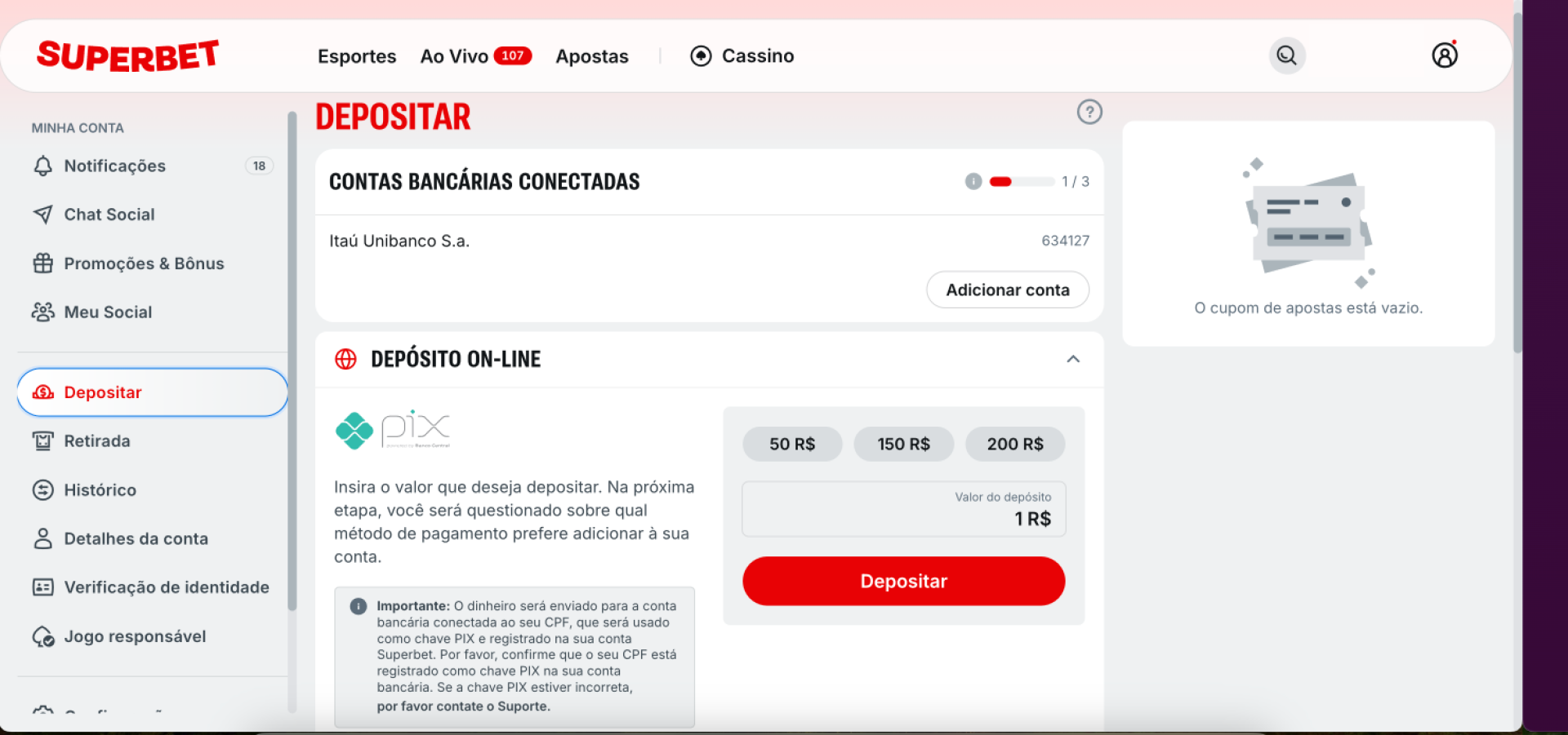 Qual o valor mínimo para depositar na Superbet via pix?