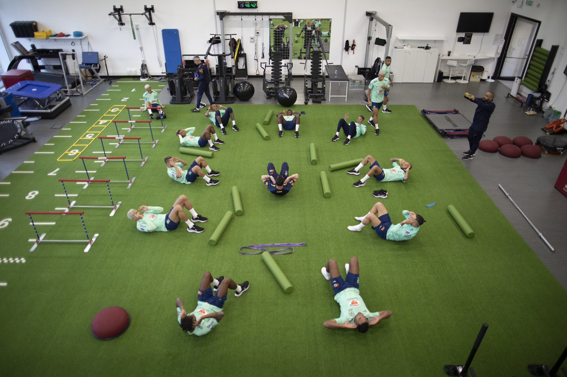 O treino de hoje (14/11) foi dividido em dois espaços: na academia, um trabalho regenerativo para os atletas que atuaram no final de semana pelos seus respectivos clubes. Em campo, o técnico Tite comandou de perto uma movimentação leve no campo principal do complexo esportivo italiano.