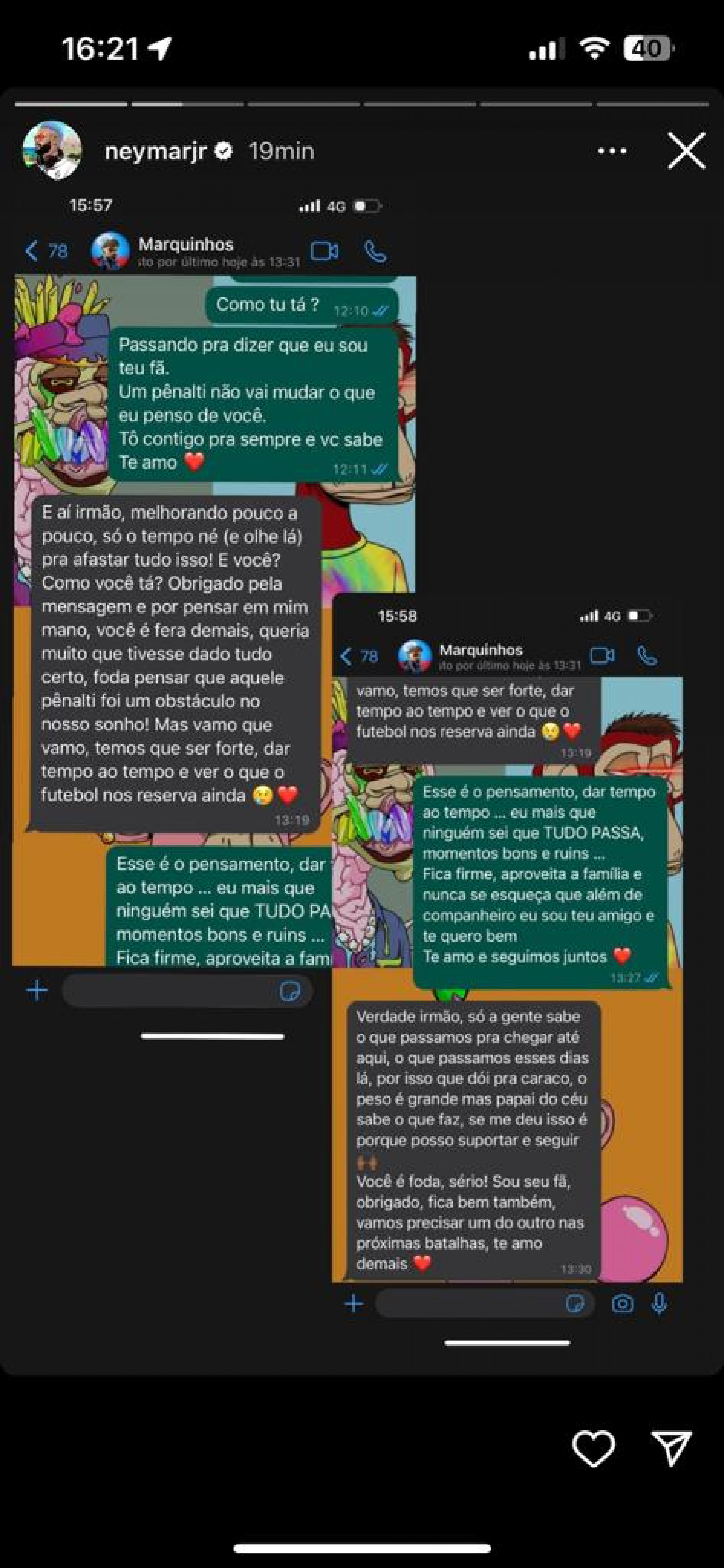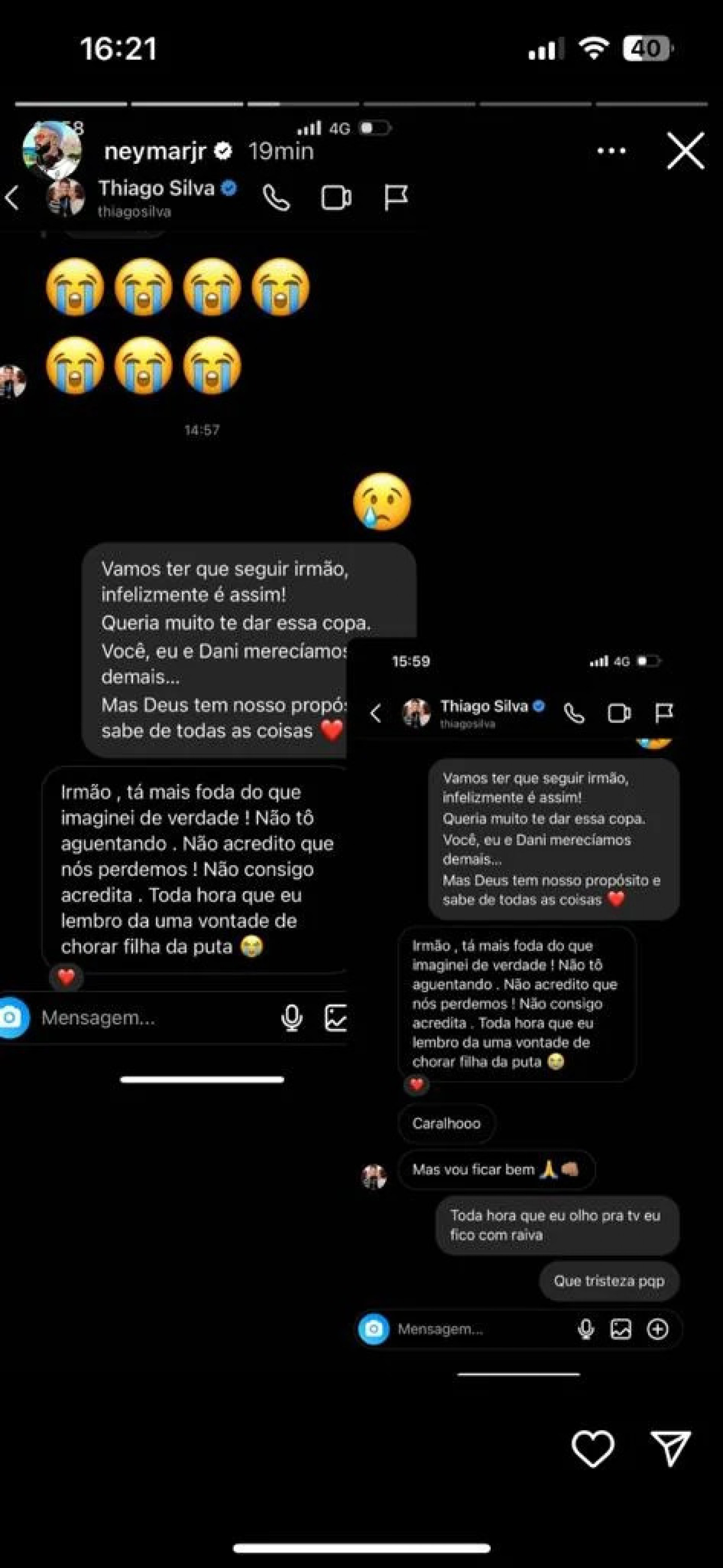 Por fim, Neymar mostrou as conversas com o capitão Thiago Silva, que, emotivo, respondeu estar "mais f*** do que imaginei, de verdade" e que não acredita "que nós perdemos, toda hora que eu lembro, dá uma vontade de chorar, mas vou ficar bem".