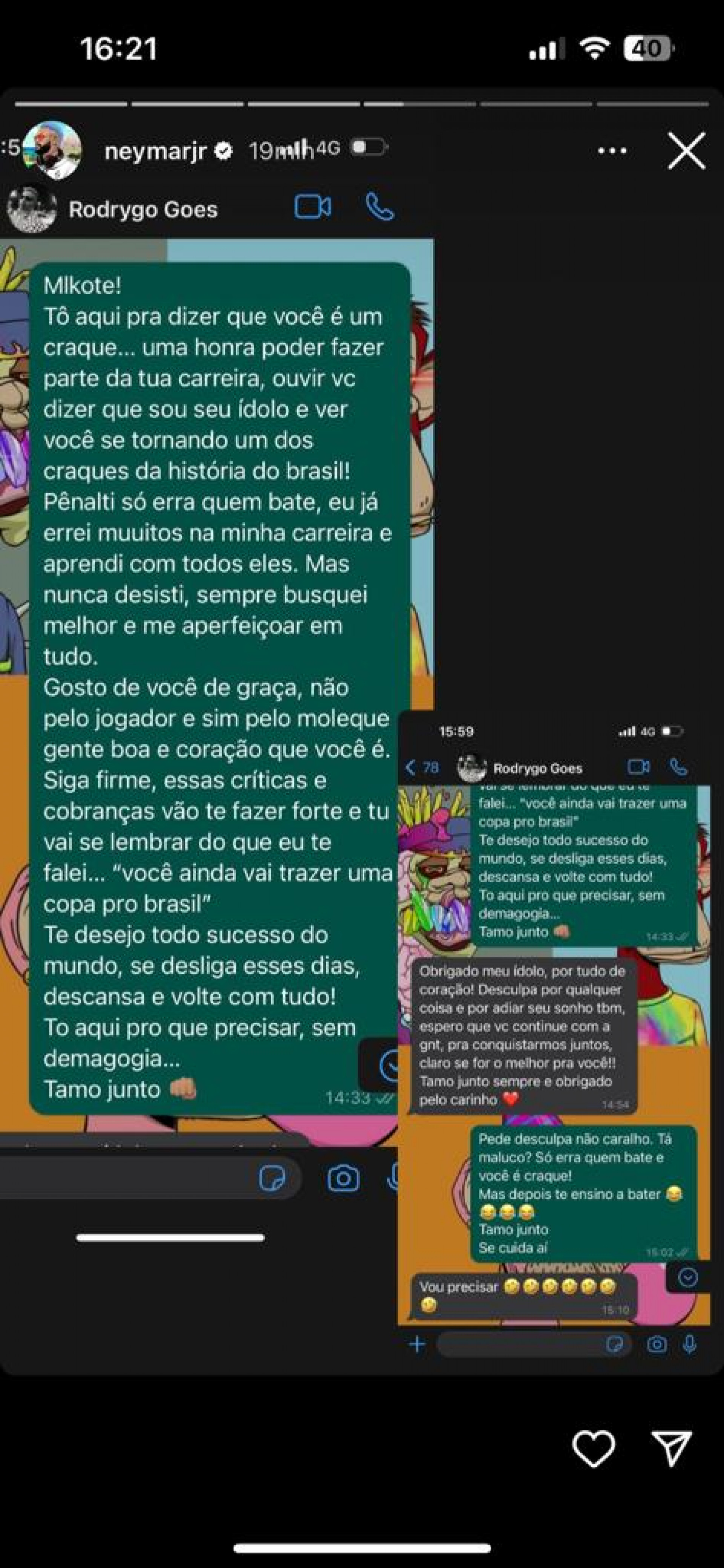 Já para Rodrygo, de apenas 21 anos, Neymar escreveu que é "uma honra poder fazer parte da tua carreira, ouvir de você que sou seu ídolo e ver você se tornando um dos craques da história do Brasil".