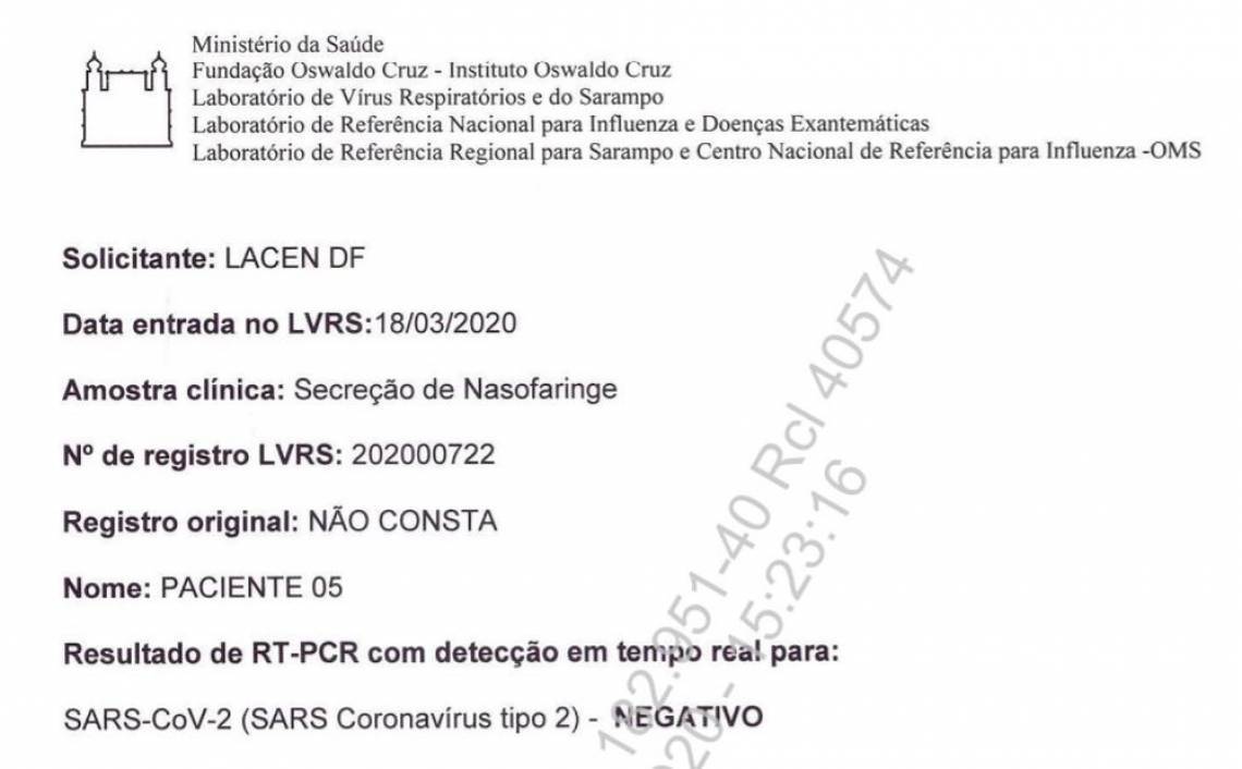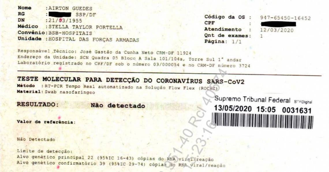 Em outro documento, também divulgado por determinação de Lewandowski, o coordenador de Saúde da Presidência, o urologista Guilherme Guimarães Wimmer, informou que recebeu em 6 de maio o resultado da Fiocruz referente à coleta feita quase dois meses antes, em 17 de março.