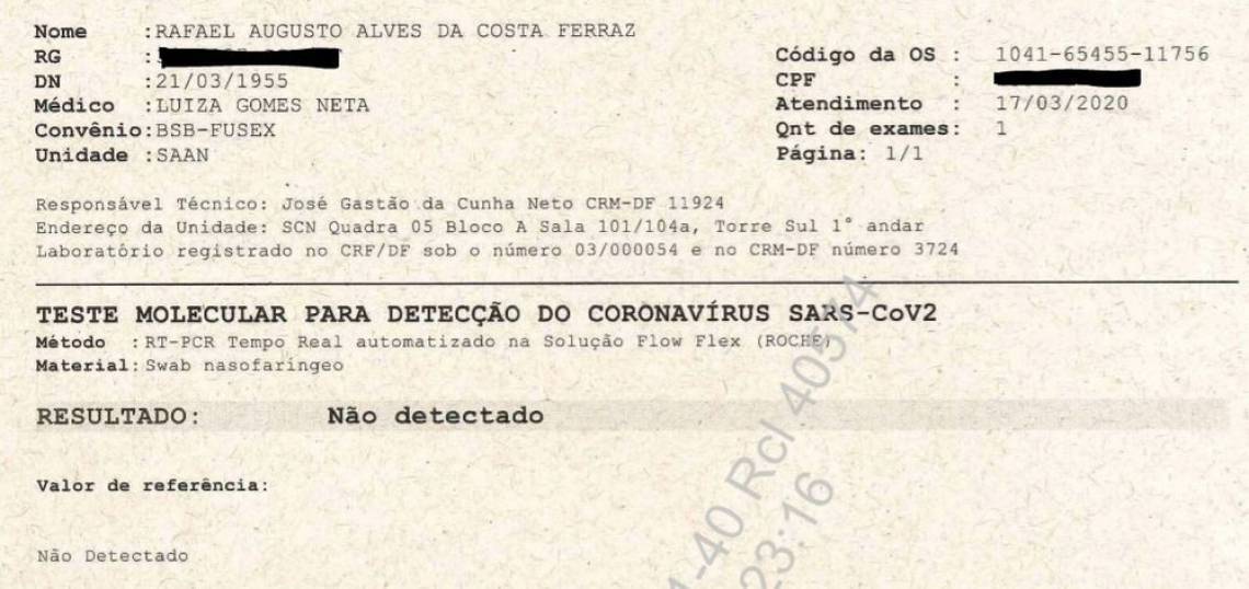 O primeiro exame entregue por Bolsonaro (com o codinome "Airton Guedes") foi feito em 12 de março na unidade do Sabin no Hospital das Forças Armadas, logo depois que o presidente voltou dos EUA. O segundo teste (codinome Rafael Augusto Alves da Costa Ferraz) ocorreu em 17 de março.