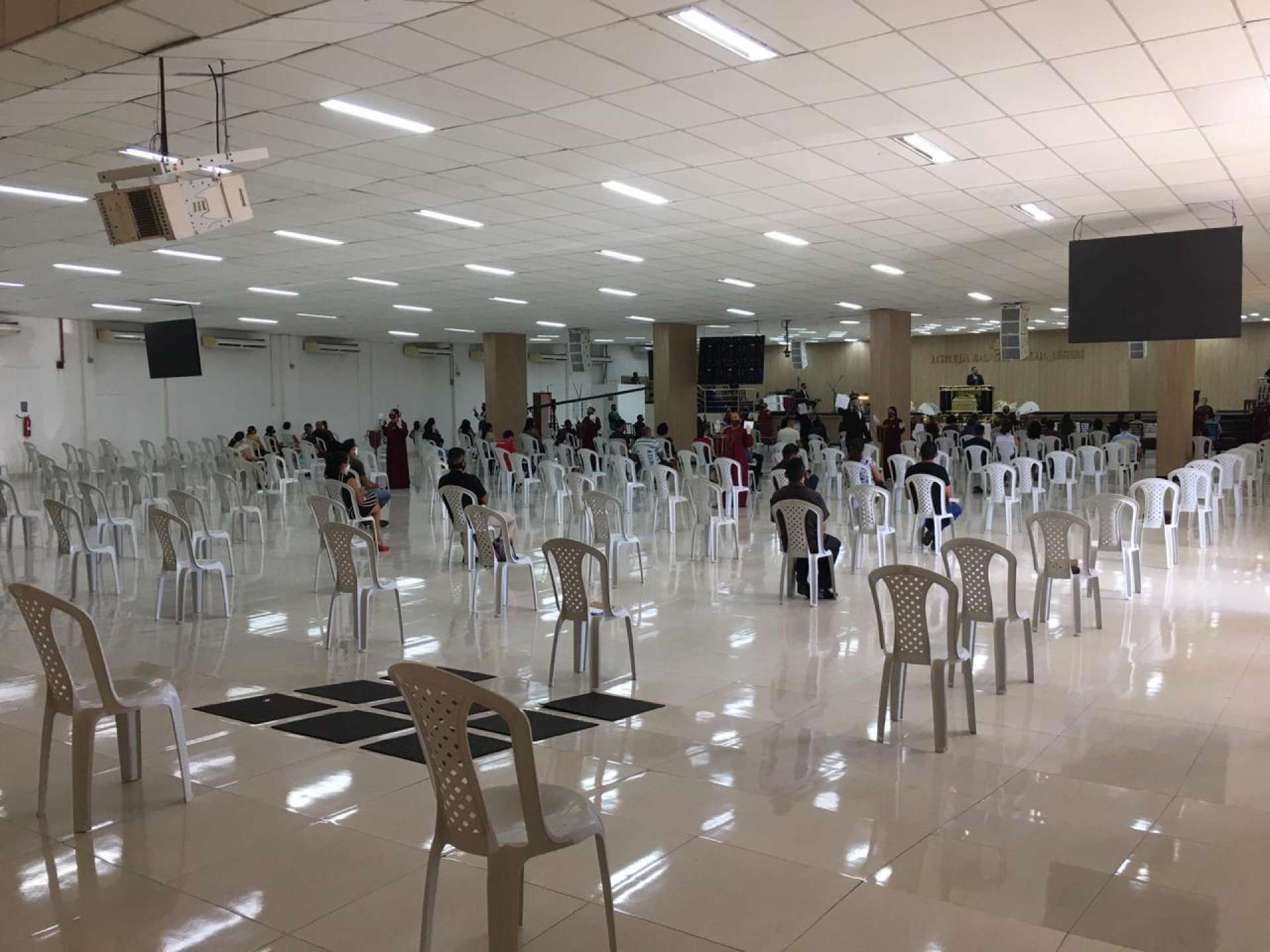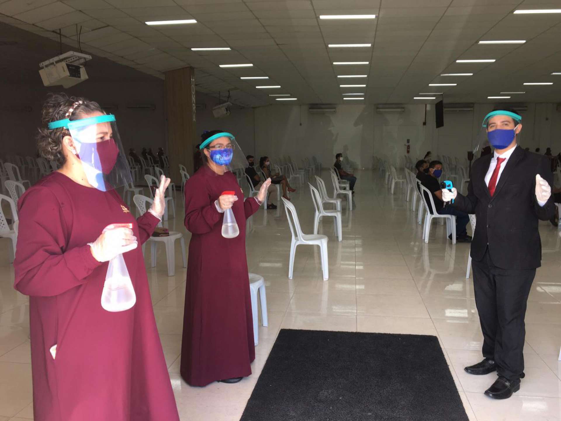 O espaço infantil da igreja está fechado e há distanciamento entre as cadeiras e sinalizações que alertam para a medida. O pastor Marcos Vilar afirmou que não haverá mudanças na instituição e que eles não irão aumentar a capacidade de pessoas nos cultos presenciais. Mesmo com o retorno, as programações virtuais também continuarão.