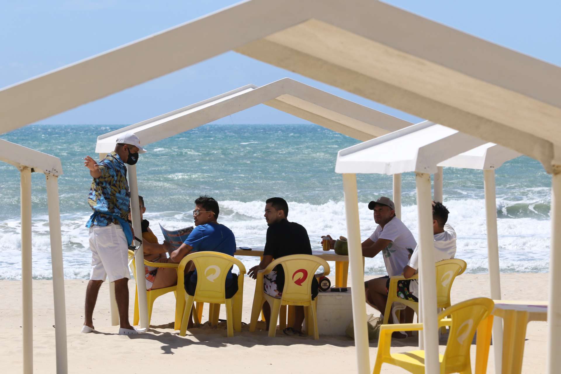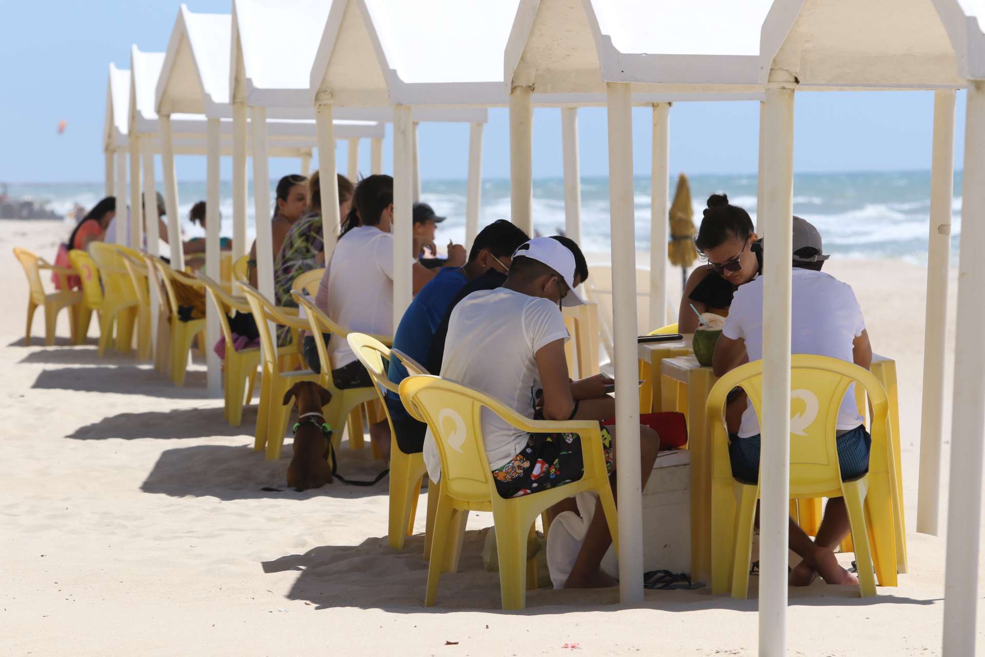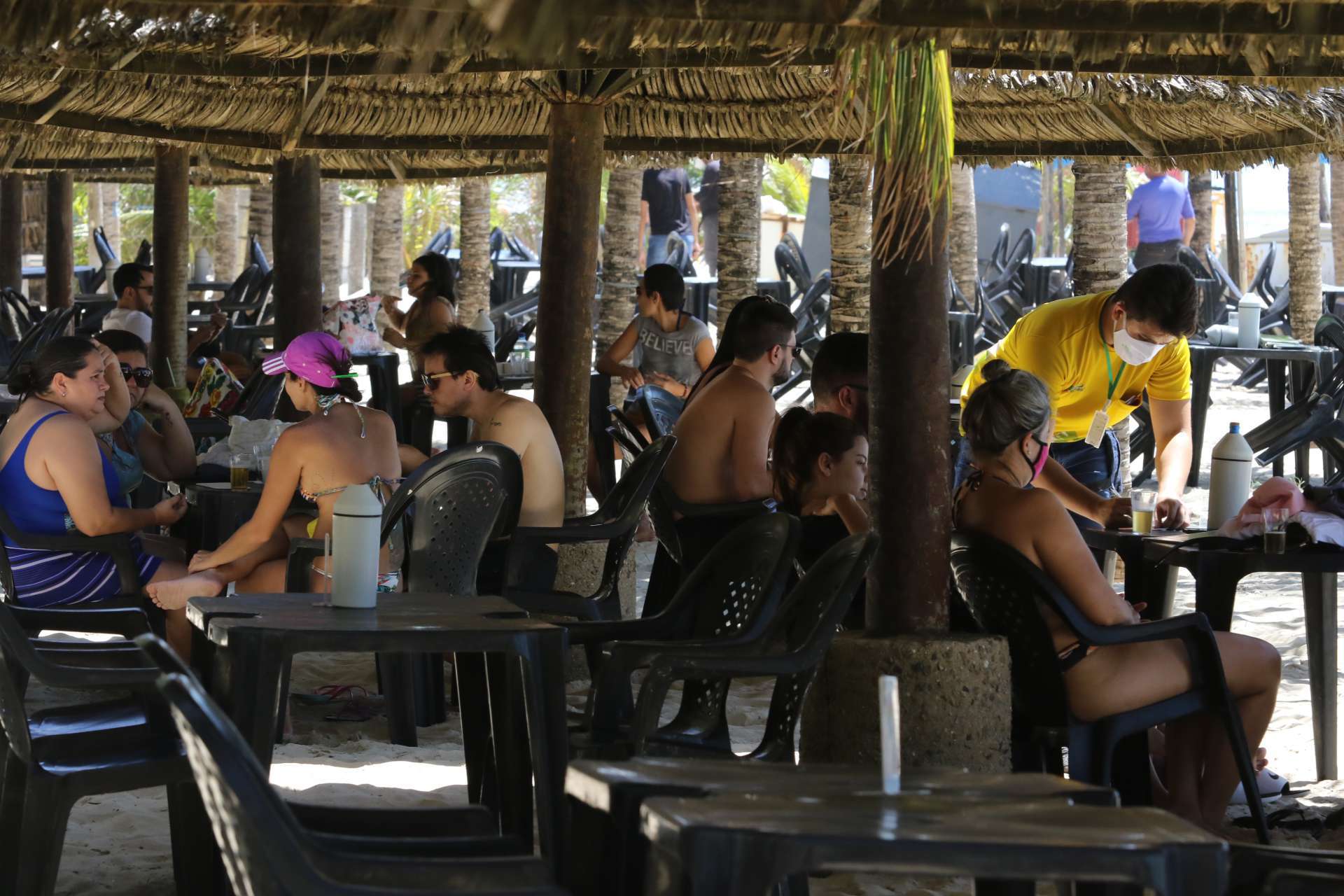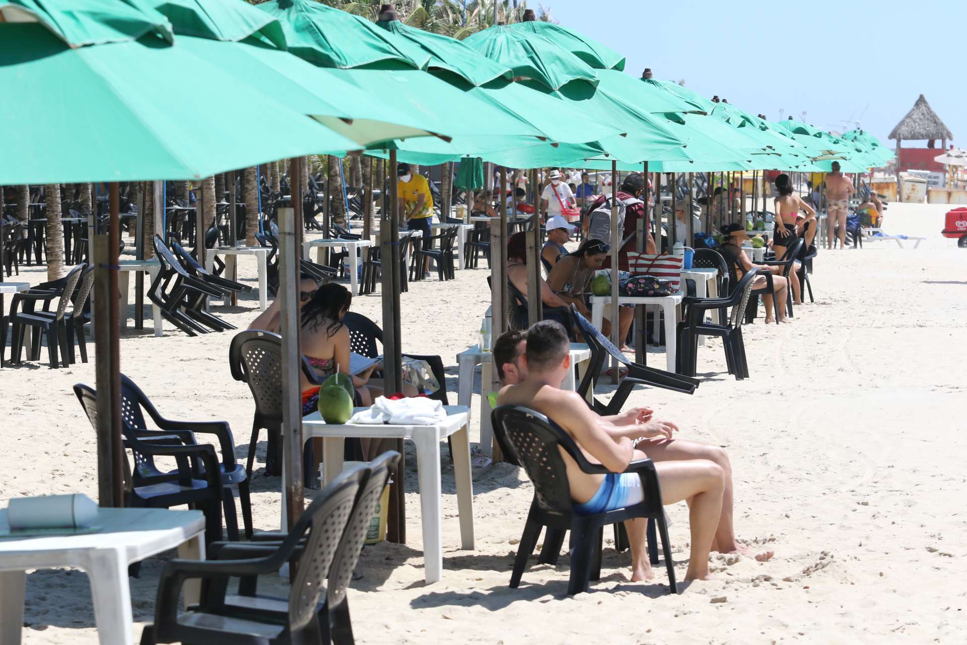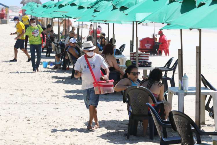 Homens, mulheres e crianças aproveitaram o dia ensolarado em Fortaleza para irem à praia, que já mostrava aglomerações mesmo antes de as barracas reabrirem. Nesses estabelecimentos, a grande maioria dos clientes não utilizavam máscaras e aguardavam por atendimento formando pequenos grupos, descumprindo a orientação de distanciamento dada por órgãos sanitários.