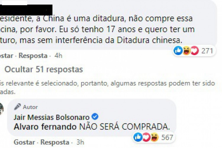 Na rede social, a pessoa escreveu: "Presidente, a China é uma ditadura, não compre essa vacina, por favor. Eu só tenho 17 anos e quero ter um futuro, mas sem interferência da ditadura chinesa". Bolsonaro respondeu: "Não será comprada."