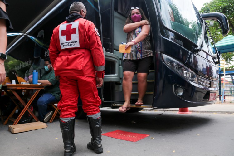 Moradores de territórios vulneráveis de Fortaleza começaram a ser atendidos, nesta quinta-feira, 14, pelo “Ônibus da Vacina”, da Cruz Vermelha Brasileira (CVB), ação que pretende imunizar cerca de 10 mil pessoas contra a Covid-19 na Capital cearense até o dia 9 de novembro. A campanha, realizada em parceria com a Secretaria de Saúde Municipal (SMS), teve início na praça Carandiru, no bairro Carlito Pamplona. Nas próximas três semanas, a unidade móvel deve visitar outras 21 localidades periféricas da cidade.