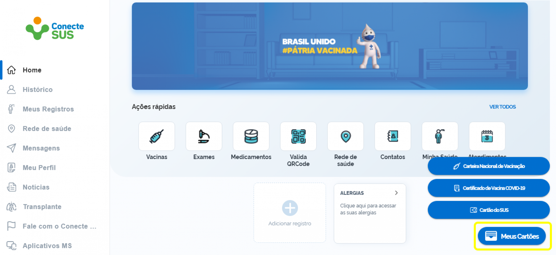 3 – Feito o login, diversas funcionalidades serão liberadas; no canto inferior direito da tela, há o botão "Meus cartões", no qual existe a opção "Certificado de Vacina Covid-19";