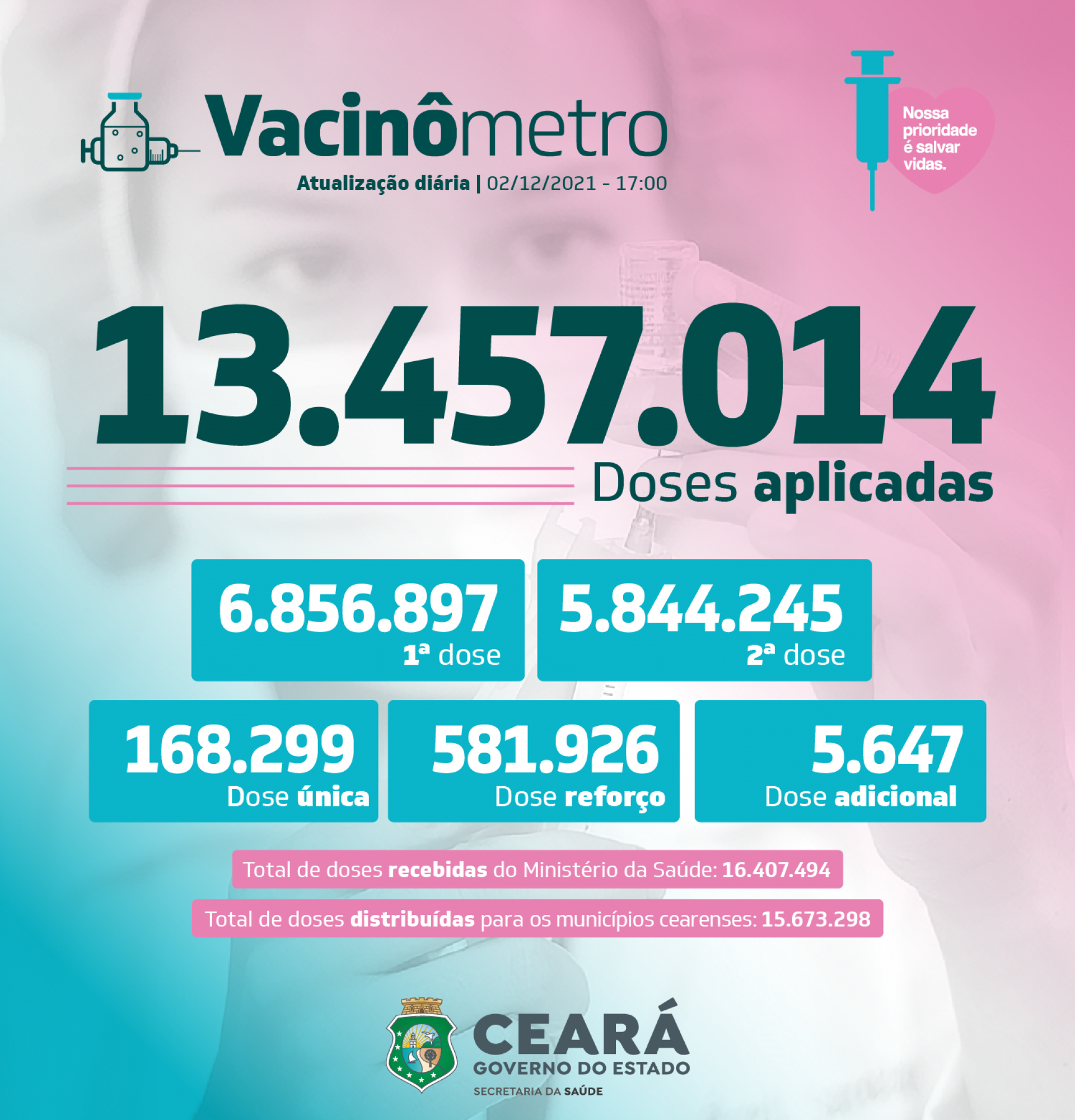 Última atualização do Vacinômetro, dispositivo que monitora a quantidade de doses da vacina contra a Covid-19 aplicadas em Fortaleza, indicou que, ao todo, 7.025.196 doses (D1 e dose única) foram administradas na população fortalezense.