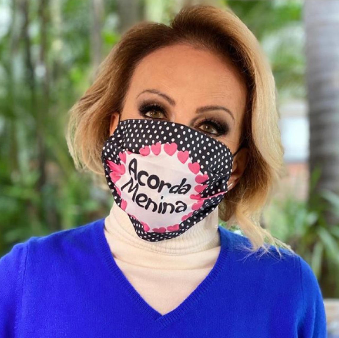 Ana Maria Braga usa máscara com a frase "acorda menina"