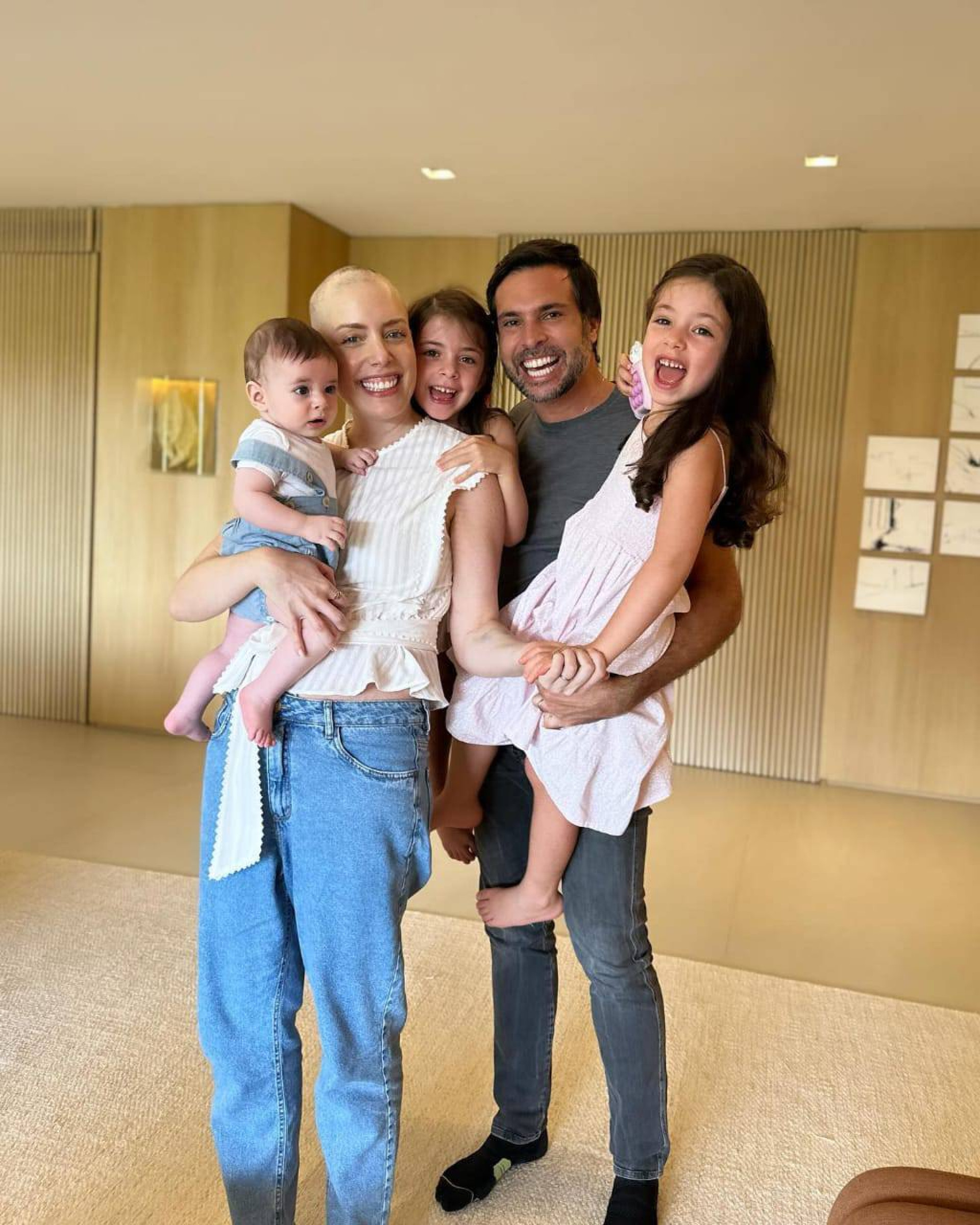 "Em casa! Obrigada, meu Deus! Primeiro intervalo entre os ciclos para dar muita força para continuar o tratamento!", escreveu Fabiana na legenda da publicação. Nas fotos, ela aparece sorridente ao lado do marido, o empresário Bruno Levi D’Ancona, e dos três filhos, as gêmeas Chiara e Siena, de 5 anos, e o caçula Luigi, de 6 meses.