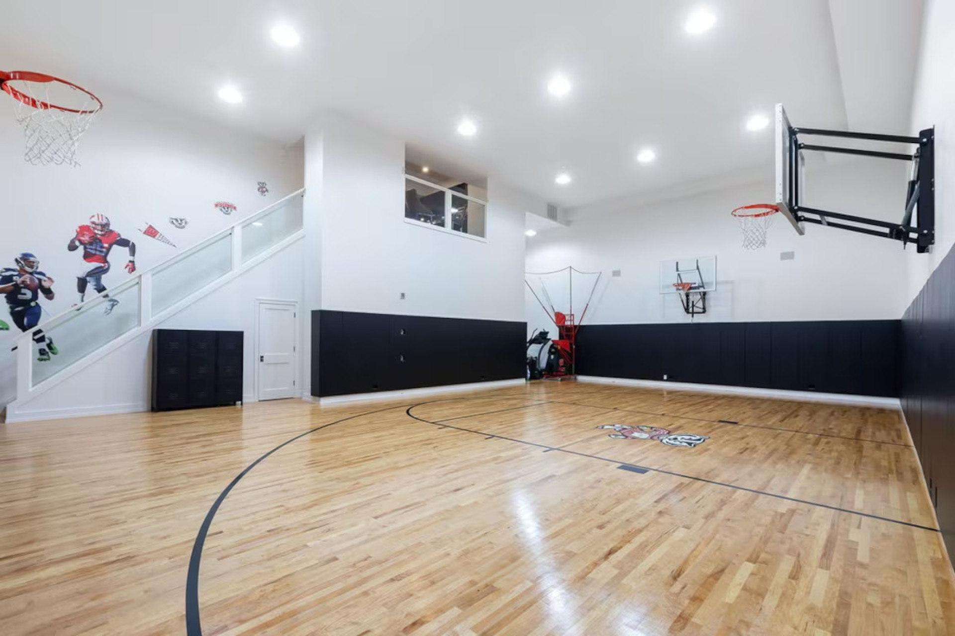Com cinco quartos, seis banheiros, ampla sala de estar, lavanderia, academia, espaço de recreação, quadra esportiva, sala de cinema e garagem com espaço para três carros, a residência contabiliza 847 m² de área construída.