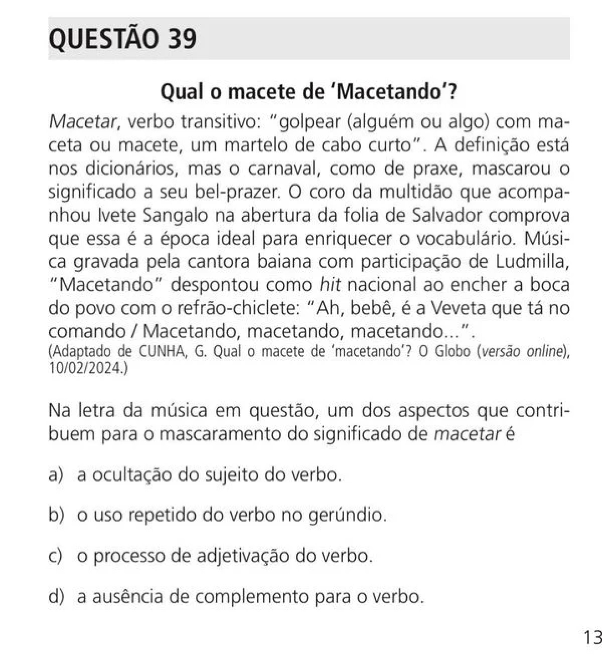 A questão de Português abordou o sentido da palavra no refrão, a partir do trecho de uma reportagem do jornal O Globo, publicada em fevereiro deste ano. Nas redes sociais, a questão viralizou.