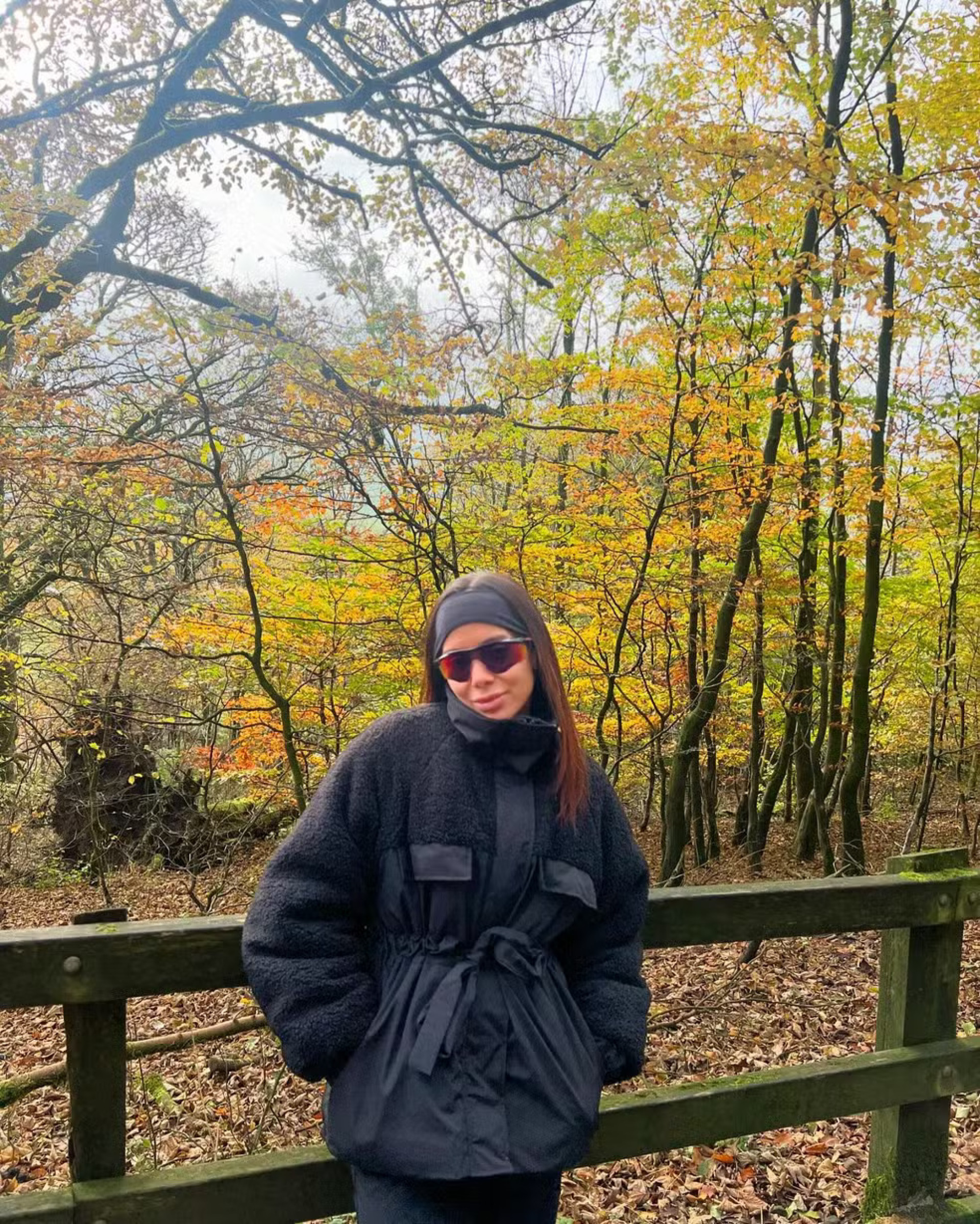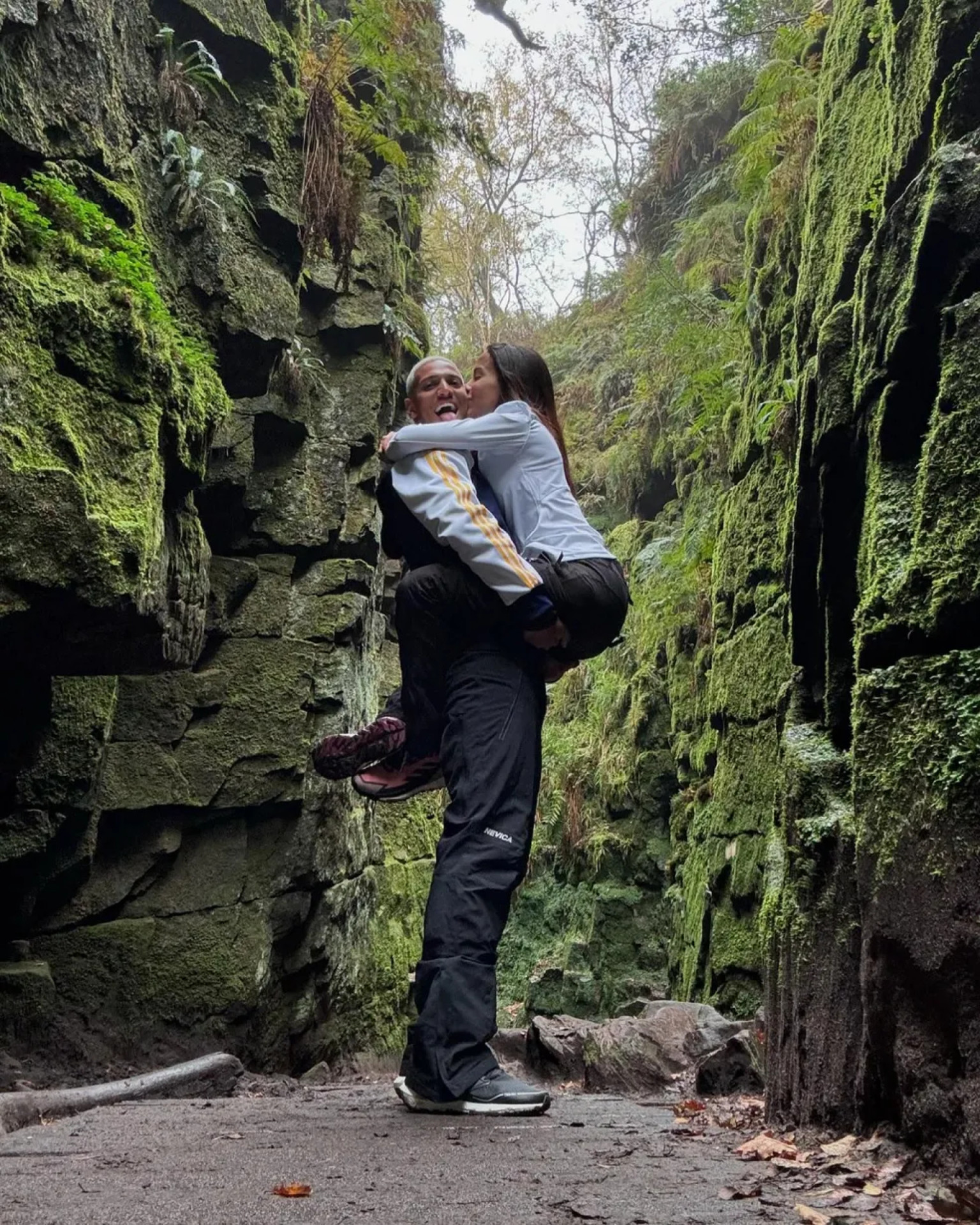 Sem dar detalhes da localização, Anitta e Vinícius aproveitaram o clima frio da floresta para curtir a sós.