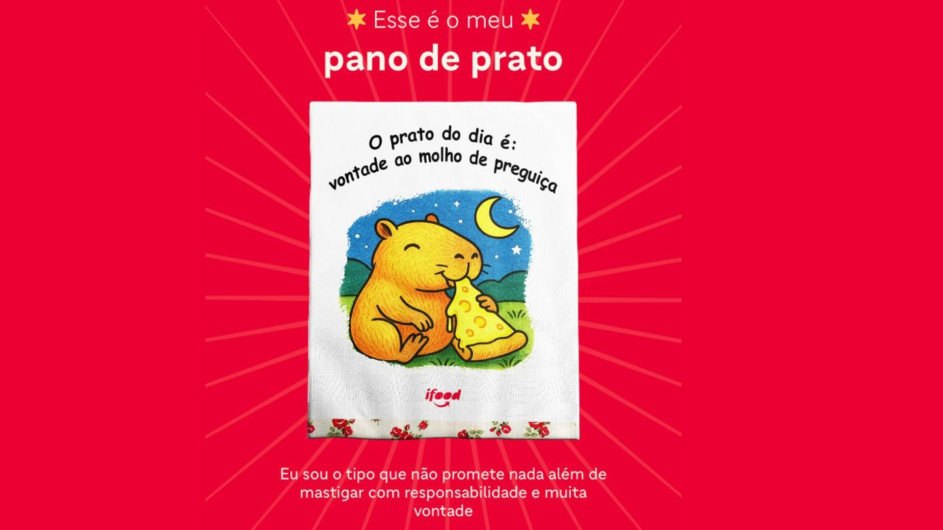 Uma das telas mais esperadas simula o "pano de prato" exclusivo do cliente, com estampas divertidas e frases que justificam o momento do pedido.